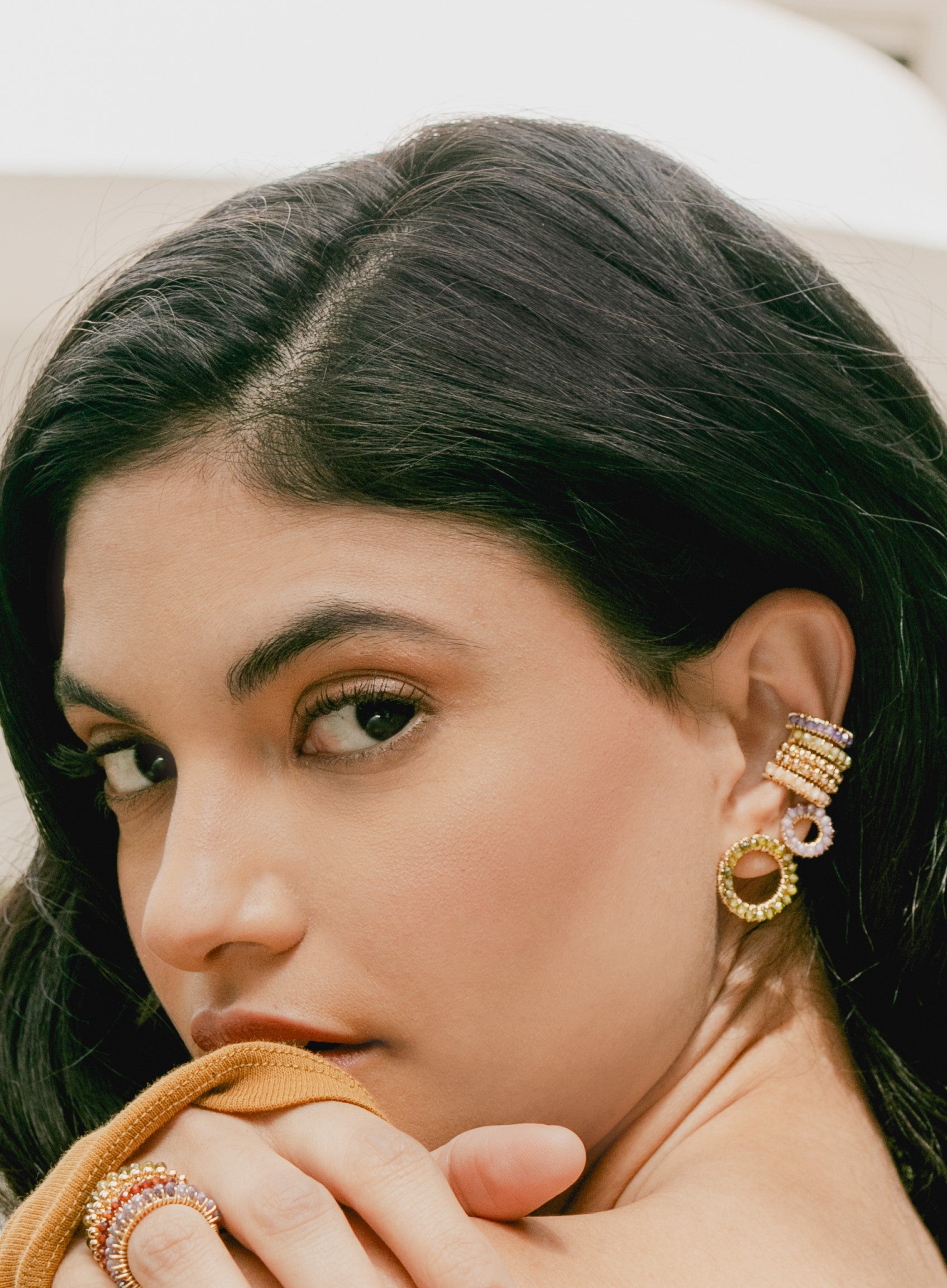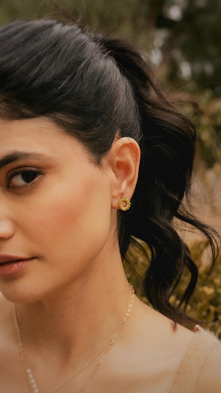 MONTURA EN BRONCE BAÑADO EN ORO DE 14K. ORNAMENTADA A MANO CON CRISTALES/ PIEDRA SEMI PRECIOSA.